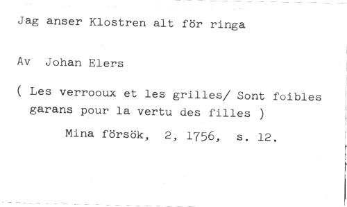 Jag anser Klostren alt för ringa Av Johan Elers //// Les verrooux et les grilles/ Sont foibles garans pour la vertu des filles ) //// Mina försök, 2, 1756, s. 12.