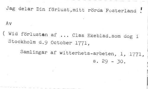 Jag delar Din förlust,mitt rörda Fosterland ! Av //// ( Wid förlusten af ... Clas Ekeblad.som dog i Stockholm d.9 October 1771, //// Samlingar af witterhets-arbeten, 1, 1771, //// s. 29 - 30.