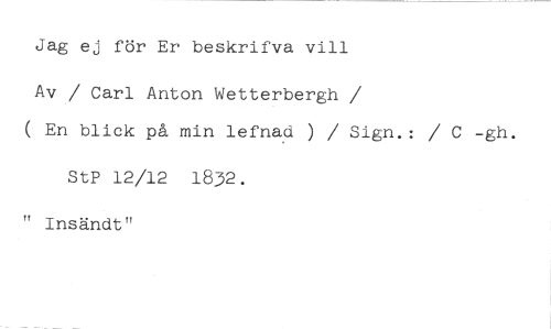 Jag ej för Er beskrifva vill //// Av / Carl Anton Wetterbergh //// /( En blick på min lefnad ) / Sign.: / C -gh. //// StP 12/12 1832. " Insändt"