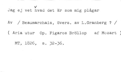 1 //// Jag ej vet hvad det är som mig plågar //// Av / Beaumarchais, övers, av L.Granberg //// /( Aria utur Op. Figaros Bröllop af Mozart ) //// MT, 1826, s. 32-36.