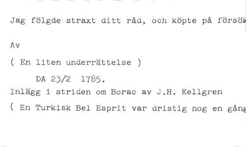 Jag fölgde straxt ditt råd, och köpte på försö1 //// Av //// ( En liten underrättelse ) //// DA 23/2 1785. //// Inlägg i striden om Borac av J.H. Kellgren //// ( En Turkisk Bel Esprit var dristig nog en gånk