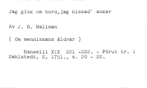 Jag gick om bord, jag hissad' ankar //// Av J. G. Hallman //// ( Om menniskans åldrar ) //// Hanselli XIX 221 -222. - Förut tr. i Sahlstedt, 2, 1751., s. 20 - 22.