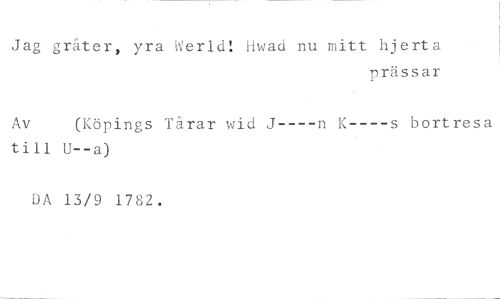 Jag gråter, yra Werld! Hwad nu mitt hjerta //// prässar //// Av (Köpings Tårar wid J----n K----s bortresa //// till U--a) //// DA 13/9 1782.