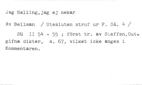 Jag Halling,jag ej nekar //// Av Bellman / Utesluten strof ur F. Så. 4 //// /SU II 54 - 55 ; först tr. av Steffen,Out: gifna dikter, s. 67, vilket icke anges i Kommentaren.