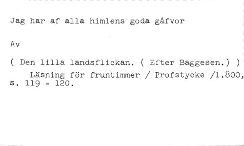 Jag har af alla himlens goda gåfvor //// Av //// ( Den lilla landsflickan. ( Efter Baggesen.) //// Läsning för fruntimmer / Profstycke /1.800, s. 119 - 120.
