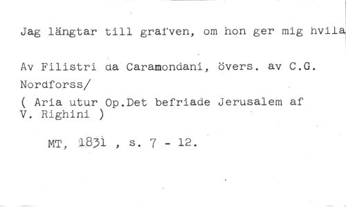 Jag längtar till grafven, om hon ger mig hvila //// Av Filistri da Caramondani, övers, av C.G. Nordforss //// /( Aria utur Op.Det befriade Jerusalem af V. Righini ) //// MT, 1831 , s. 7 - 12.
