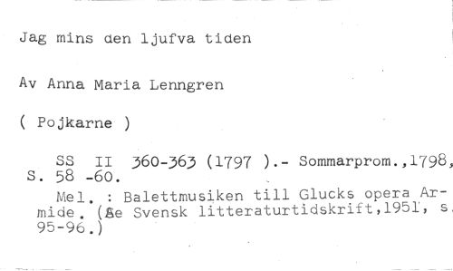 Jag mins den ljufva tiden //// Av Anna Maria Lenngren ( Pojkarne ) //// SS II 360-363 (1797 ).- Sommarprom.,1798, //// S. 58 -60. • //// Mel. : Balettmusiken till Glucks opera Armide. (Be Svensk litteraturtidskrift,1951, s, 95-96.)