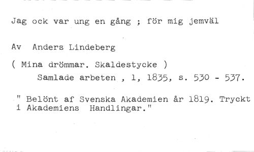 Jag ock var ung en gång ; för mig jemväl Av Anders Lindeberg //// ( Mina drömmar. Skaldestycke ) //// Samlade arbeten , 1, 1835, s. 530 - 537. //// " Belönt af Svenska Akademien år 1819. Tryckt i Akademiens Handlingar."
