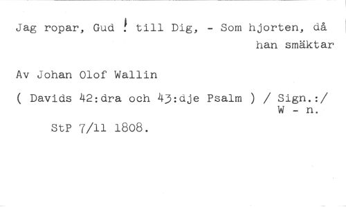 Jag ropar, Gud . till Dig, - Som hjorten, då //// han smäktar //// Av Johan Olof Wallin //// ( Davids 42:dra och 43:dje Psalm ) / Sign.: //// /W - n. //// StP 7/11 1808.