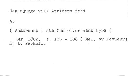Jag sjunga vill Atriders fejd //// Av //// ( Anakreons 1 sta Ode.Öfver hans Lyra ) //// MT, 1802, s. 105 - 108 ( Mel. av Lesueur). Ej av Paykull.