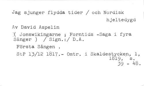 Jag sjunger flydda tider / och Nordisk //// hjeltedygd //// Av David Aspelin //// Jomswikingarne ; Forntids -Saga i fyra Sånger ) / Sign.:/ D.A. //// Första Sången . //// StP 13/12 1817.- Omtr. i Skaldestycken, 1, //// 1819, s. //// 39 - 48.