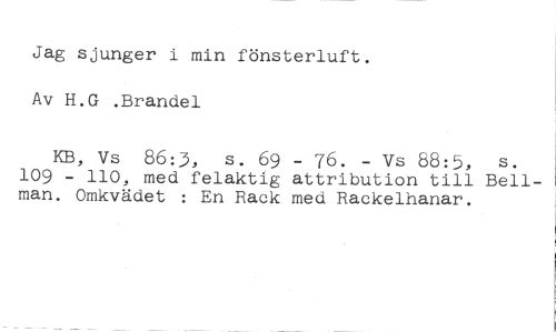 Jag sjunger i min fönsterluft. Av H.G .Brandel //// KB, Vs 86:3, s. 69 - 76. - Vs 88:5, s. 109 - 110, med felaktig attribution till Bellman. Omkvädet : En Rack med Rackelhanar.