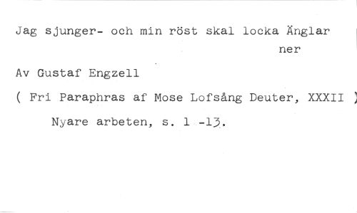 Jag sjunger- och min röst skal locka Änglar //// ner //// Av Gustaf Engzell //// ( Fri Paraphras af Mose Lofsång Deuter, XXXII Nyare arbeten, s. 1 -13,