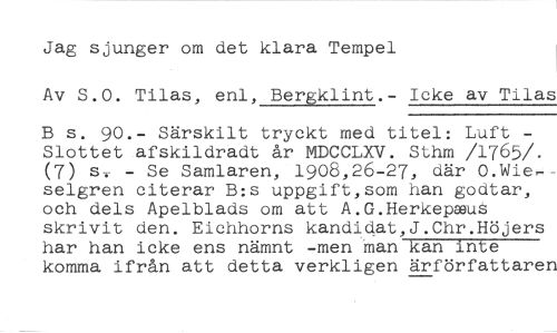 Jag sjunger om det klara Tempel //// Av S.O. Tilas, enl, Bergklint.- Icke av Tilas //// B s. 90.- Särskilt tryckt med titel: Luft Slottet afskildradt år MDCCLXV. Sthm /1765/. (7) s - Se Samlaren, 1908,26-27, där 0.Wie-- selgren citerar B:s uppgift,som han godtar, och dels Apelblads om att A.G.Herkepwuå skrivit den. Eichhorns kandidat,J.Chr.Höjers har han icke ens nämnt -men man kan inte komma ifrån att detta verkligen ärförfattaren