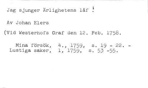 Jag sjunger Ärlighetens låf Av Johan Elers //// (Vid Westerhofs Graf den 12. Feb. 1758. //// Mina försök, 4., 1759, s. 19 - 22. //// Lustiga saker, 1, 1759, s. 53 -55. //// -