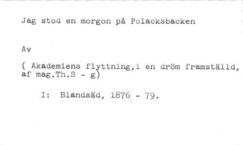 Jag stod en morgon på Polacksbacken Av //// ( Akademiens flyttning,i en dröm framställd, af mag.Th.S - g) //// I: Blandsäd, 1876 - 79.