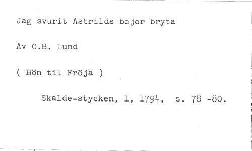 Jag svurit Astrilds bojor bryta //// Av O.B. Lund //// ( Bön til Fröja ) //// Skalde-stycken, 1, 1794, s. 78 -80.