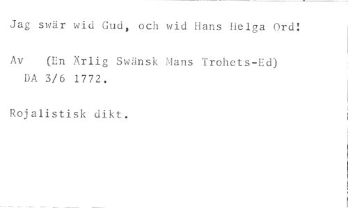 Jag swär wid Gud, och wid Hans Helga Ords //// Av (En Ärlig Swänsk Mans Trohets-Ed) //// DA 3/6 1772. //// Rojalistisk dikt.