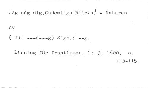 jag såg dig,Gudomliga Flicka! - Naturen //// Av //// ( Til ---a---g) Sign.: --g. //// Läsning för fruntimmer, 1: J, 1800, s. //// 113-115.