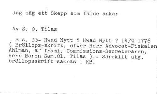 Jag såg ett Skepp som fälde ankar Av S. 0. Tilas //// B s. 33- Hwad Nytt ? Hwad Nytt ? 14/9 1776 ( Bröllops-skrift, öfwer Herr Advocat-Fiskalen Ahlman, af frami. Commissions-Secreteraren, Herr Baron Sam.01. Tilas ).- Särskilt utg. bröllopsskrift saknas i KB.