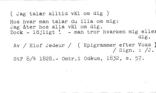 ( Jag talar alltid väl om dig ) //// Hos hvar man talar du illa om mig: //// Jag åter hos alla väl om dig. //// Dock - löjligt t - man tror hvarken mig eller //// dig. //// Av / Elof Jedeur / ( Epigrammer efter Voss j //// / Sign. : /J. //// StP 8/4 1828.- Omtr.i Odhum, 1832, s. 57.
