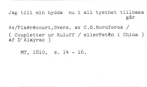 Jag till min hydda nu i all tysthet tillbaka //// går //// Av/Pixcourt,övers. av C.G.Nordforss //// /( Coupletter ur Kuluff / ellerFetn i China af D'Alayrac ) //// MT, 1810, s. 14 - 16.