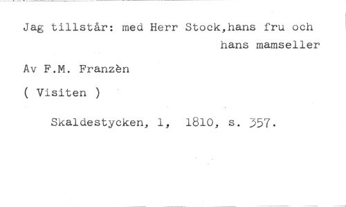 Jag tillstår: med Herr Stock,hans fru och //// hans mamseller //// Av F.M. Franzén ( Visiten ) //// Skaldestycken, 1, 1810, s. 57.