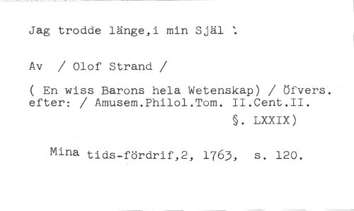 Jag trodde länge,i min Själ Av / Olof Strand //// /( En wiss Barons hela Wetenskap) / öfvers. efter: / Amusem.Philol.Tom. II.Cent.II. //// §. LXXIX) //// Mina tids-fördrif,2, 1763, s. 120.