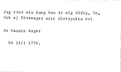 Jag tror min Kung Han är mig Nådig, Go, Och ej förswagar mitt förtryckta bo! //// Av Haquin Bager DA 24/1 1776.