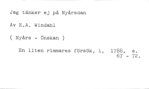 Jag tänker ej på Nyårsdan Av E.A. Windahl //// ( Nyårs - önskan ) //// En liten rimmares försök, 1, 1788, s. //// 67 - 72.