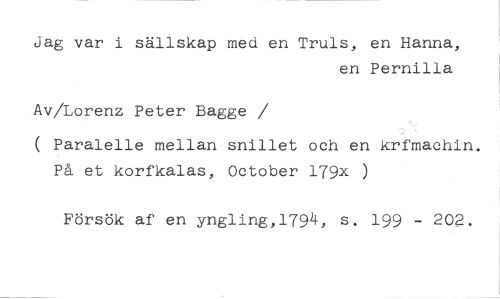Jag vari sällskap med en Truls, en Hanna, //// en Pernilla //// Av/Lorenz Peter Bagge //// /( Paralelle mellan snillet och en krfmachin. På et korfkalas, October 179x ) //// Försök af en yngling,1794, s. 199 - 202.