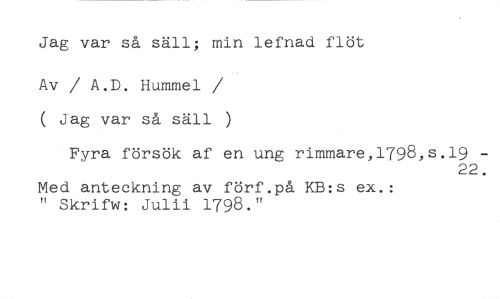 Jag var så säll; min lefnad flöt //// Av / A.D. Hummel / ( Jag var så säll ) //// Fyra försök af en ung rimmare,1798,s.19 - //// 22. //// Med anteckning av förf.på KB:s ex.: //// " Skrifw: Julii 1798."