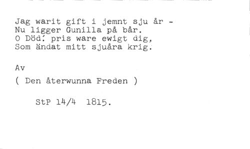 Jag warit gift i jemnt sju år Nu ligger Gunilla på bår. 0 Död: pris ware ewigt dig, Som ändat mitt sjuåra krig. //// Av //// ( Den återwunna Freden ) //// StP 14/4 1815.