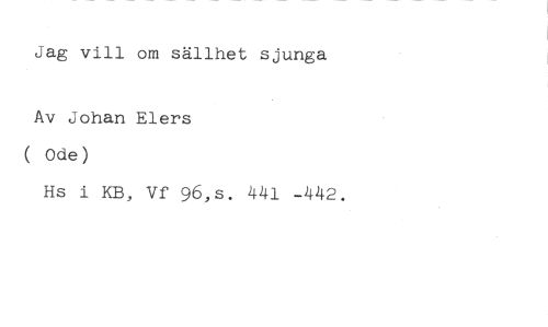 Jag vill om sällhet sjunga //// Av Johan Elers ( Ode) //// Hs i KB, Vf 96,s. 441 -442.