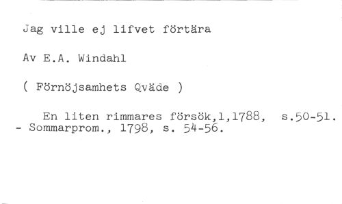 Jag ville ej lifvet förtära Av E.A. Windahl //// ( Förnöjsamhets Qväde ) //// En liten rimmares försök,1,1788, s.50-51. - Sommarprom., 1798, s. 54-56.