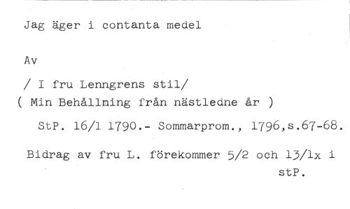 Jag äger i contanta medel Av //// / I fru Lenngrens stil //// /( Min Behållning från nästledne år ) //// StP. 16/1 1790.- Sommarprom., 1796,s.67-68. //// Bidrag av fru L. förekommer 5/2 och 13/1x i //// stP.