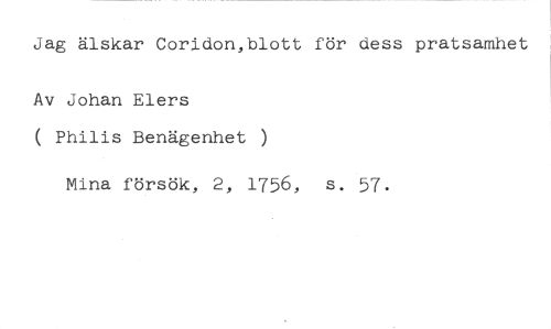 Jag älskar Coridon,blott för dess pratsamhet //// Av Johan Elers //// ( Philis Benägenhet ) //// Mina försök, 2, 1756, s. 57.