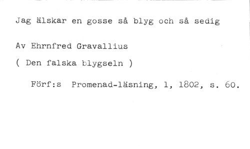 Jag älskar en gosse så blyg och så sedig //// Av Ehrnfred Gravallius ( Den falska blygseln ) //// Förf:s Promenad-läsning, 1, 1802, s. 60.