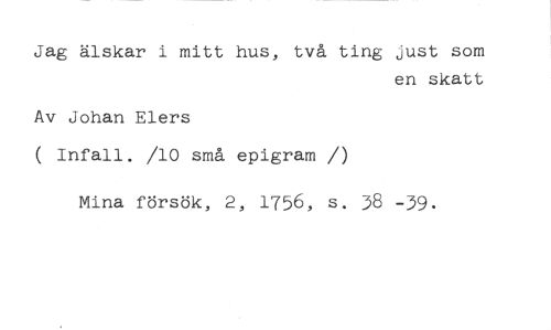 Jag älskar i mitt hus, två ting just som //// en skatt //// Av Johan Elers //// ( Infall. /10 små epigram /) //// Mina försök, 2, 1756, s. 38 -39.