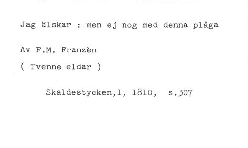 Jag älskar : men ej nog med denna plåga //// Av F.M. Franzén ( Tvenne eldar ) //// Skaldestycken,l, 1810, s.307