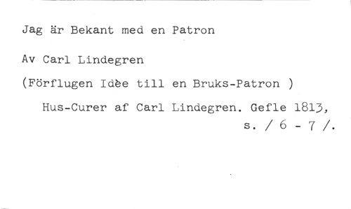 Jag är Bekant med en Patron //// Av Carl Lindegren //// (Förflugen Ide till en Bruks-Patron ) //// Hus-Curer af Carl Lindegren. Gefle 1813, //// s. / 6 - 7 /.
