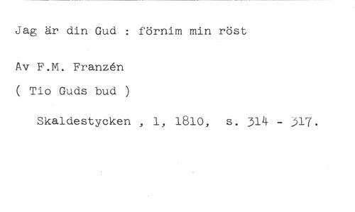 Jag är din Gud : förnim min röst //// Av F.M. Franzén ( Tio Guds bud ) //// Skaldestycken , 1, 1810, s. 314 - J17.