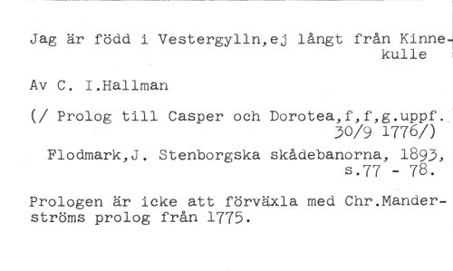 Jag är född i Vestergylln,ej långt från Kinne- //// kulle //// Av C. I.Hallman //// (/ Prolog till Casper och Dorotea,f,f,g.uppf. //// 30/9 1776/) //// Flodmark,J. Stenborgska skådebanorna, 1893, //// s.77 - 78. //// Prologen är icke att förväxla med Chr.Manderströms prolog från 1775.