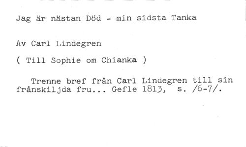 Jag är nästan Död - min sidsta Tanka //// Av Carl Lindegren //// ( Till Sophie om Chianka ) //// Trenne bref från Carl Lindegren till sin frånskiljda fru... Gefle 1813, s. /6-7/.