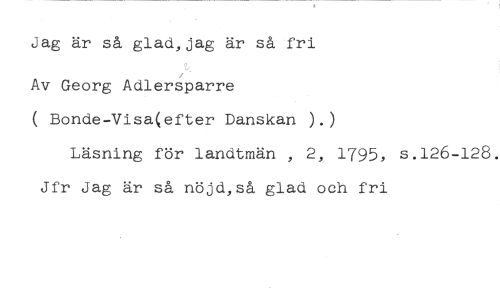 Jag är så glad, jag är så fri //// Av Georg Adlersparre //// ( Bonde-Visa(efter Danskan ).) //// Läsning för landtmän , 2, 1795, s.126-128. Jfr Jag är så nöjd, så glad och fri
