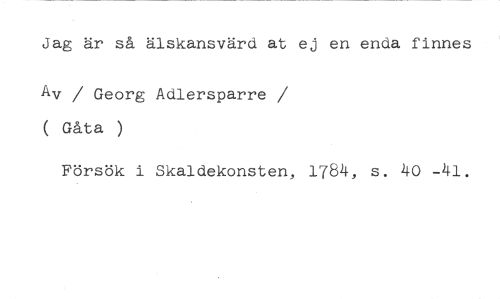 Jag är så älskansvärd at ej en enda finnes //// Av / Georg Adlersparre / ( Gåta ) //// Försök i Skaldekonsten, 1784, s. 40 -41.