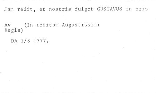 Jam recit, et nostris fulget GUSTAVUS in oris //// Av (In reditum Augustissimi //// Regis) //// DA 1/8 1777.