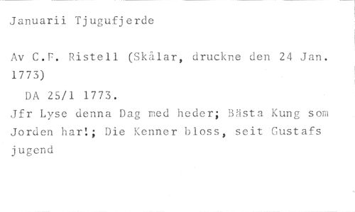 Januarii Tjugufjerde //// Av C.F. Ristell (Skålar, druckne den 24 Jan. 1773) //// DA 25/1 1773. //// Jfr Lyse denna Dag med heder; Bästa Kung som Jorden hart; Die Kenner bloss, seit Gustafs jugend