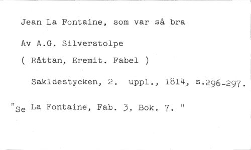 Jean La Fontaine, som var så bra .296-297. //// Av A.G. Silverstolpe //// ( Råttan, Eremit. Fabel ) //// Sakldestycken, 2. uppl., 1814, "Se La Fontaine, Fab. 3, Bok. 7. "