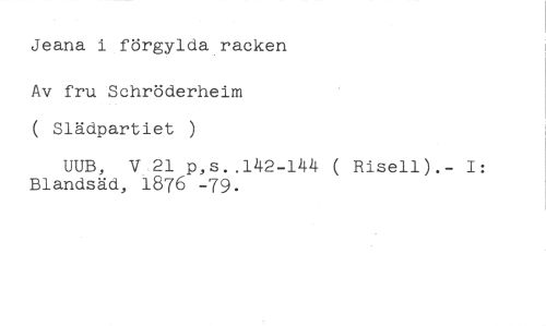 Jeana i förgylda racken //// Av fru Schröderheim ( Slädpartiet ) //// UUB, V 21 p,s..142-144 ( Risell).- 1: Blandsäd, 1876 -79.